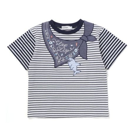 ネイビー系は、サッカーストライプ柄のサメパッチがセーラーカラーをかじっているような遊び心あふれる仕上がりです。