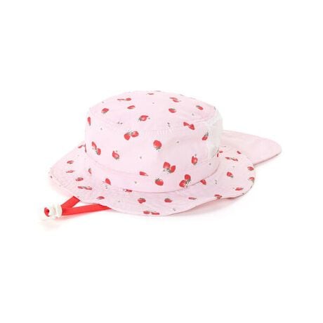 パープルの日よけにはリボンとロゴ、ピンク系にはハートとコメント入りで後ろ姿まで愛らしく。