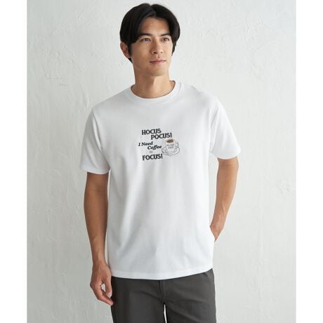 表面がなめらかで肌触りのいいポンチ素材のシンプルなTシャツに、カフェタイムを思わせる刺繍を施した遊び心のある1枚。