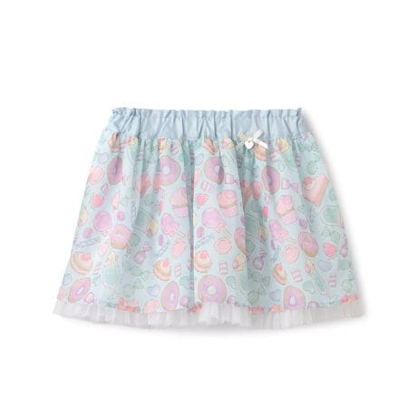 スイーツやお菓子をちりばめたパステルカラーのシフォンスカートです。オリジナルプリントとチュールを組み合わせ、女の子らしさをぎゅっと詰め込んだキュートなデザイン。ウエストが総ゴム仕様になっており、お着替えしやすいのもうれしいポイントです。シンプルなトップスを合わせると、ボトムス主役のスタイリングが完成します。【おすすめの着用時期は春夏シーズン】