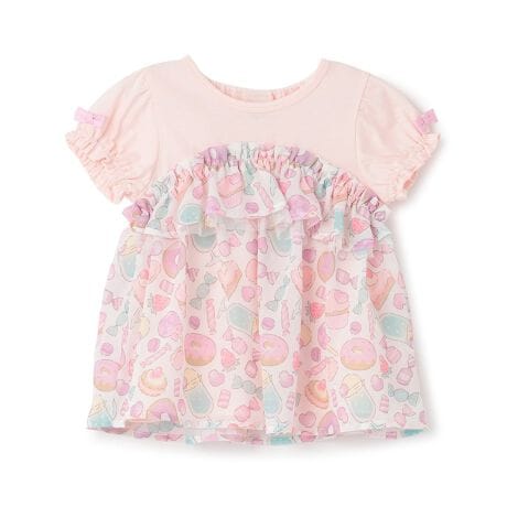 スイーツモチーフのシフォン生地をドッキングしたTシャツです。パフスリーブのミニリボンで女の子らしさをプラスしました。胸元の切り替え部分にさりげなくチュールを重ねているキュートなデザイン。後ろ衿ぐりと袖口は総ゴム仕様で、お着替えしやすいのもうれしいポイントです。