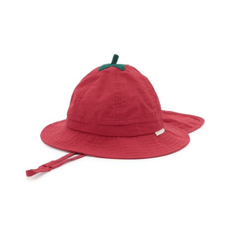 葉っぱをイメージしたてっぺんの装飾がかわいいフルーツモチーフのバケットハットです。日除け布とUVカット機能つきで、暑い日を快適に過ごせます。ストッパーを備えているあご紐も便利なポイント。普段のお出かけはもちろん、アウトドアシーンでも活躍するアイテムです。