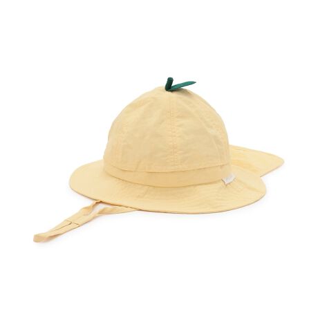 葉っぱをイメージしたてっぺんの装飾がかわいいフルーツモチーフのバケットハットです。日除け布とUVカット機能つきで、暑い日を快適に過ごせます。ストッパーを備えているあご紐も便利なポイント。普段のお出かけはもちろん、アウトドアシーンでも活躍するアイテムです。