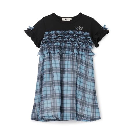 カットソーと、チェック柄の涼し気なシアー素材をドッキングしたギャザーワンピースです。軽やかな胸のフリルが、可愛らしさを演出。衿周りがカットソーなので、やさしい着心地です。通学はもちろん、ご家族とのお出掛けなど、おしゃれを楽しみたい日におすすめの1枚です。90はより着脱しやすい、左肩開きの仕様。