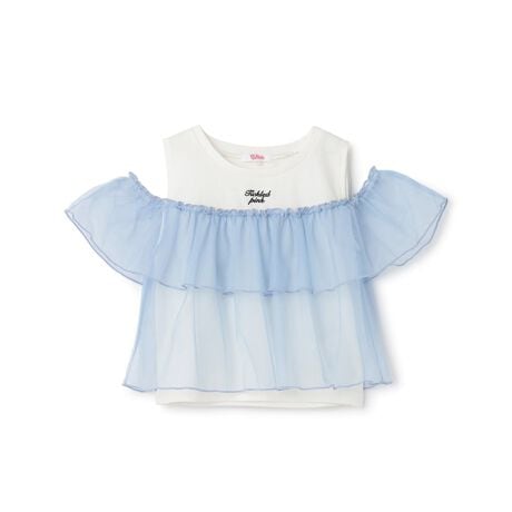 ヘルシーな肩あきデザインのトップスです。チュール素材による程よい透け感や、胸周りのフレアデザインでガーリーな印象をプラス。