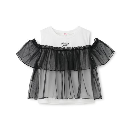 ヘルシーな肩あきデザインのトップスです。チュール素材による程よい透け感や、胸周りのフレアデザインでガーリーな印象をプラス。