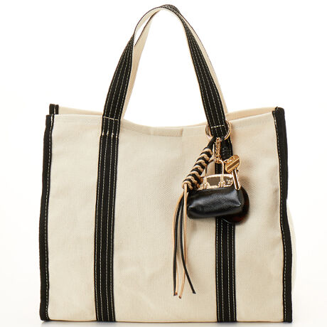 シンプルなキャンバス地のトートに存在感のあるジャラジャラチャームがポイントで、コーディネートにさりげない遊び心をプラス。