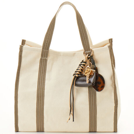 シンプルなキャンバス地のトートに存在感のあるジャラジャラチャームがポイントで、コーディネートにさりげない遊び心をプラス。