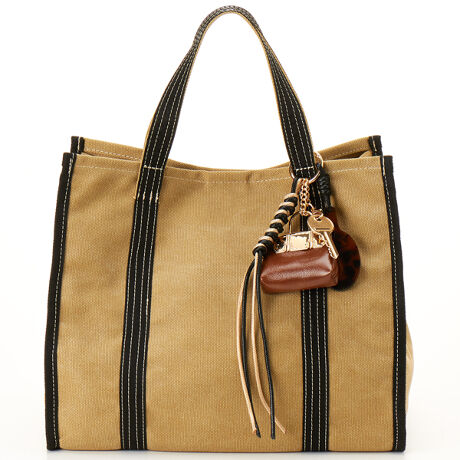 シンプルなキャンバス地のトートに存在感のあるジャラジャラチャームがポイントで、コーディネートにさりげない遊び心をプラス。