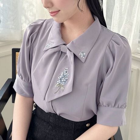 ライラックの繊細な花刺繍が、爽やかで目を惹くブラウス。