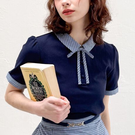 フロントのリボンタイは取り外しができるのでチェック柄の衿を活かしたシンプルめな着こなしもできる2wayデザインです。
