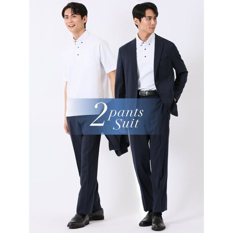 スペアパンツ付きの2パンツスーツです。消耗の激しいスラックスの替えがきくので、スーツの寿命が伸ばせて経済的。テーラージャケットは、2ボタン・ノッチドラペル・センターベント・2フラップポケット・左胸ポケット付き・2つの内ポケット付き。軽く羽織れるアンコン仕様でサマージャケットとして盛夏まで活躍してくれます。ノータックスラックスはセンタープレス加工、フロントファスナー、ベルト通し付き、前後ポケット付き、裾部分は未加工です。