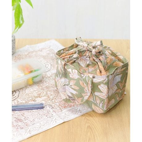 落ち着いた色調が魅力のブロックプリントの巾着付き保冷バッグ。
