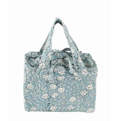 落ち着いた色調が魅力のブロックプリントの巾着付き保冷バッグ。