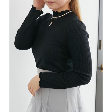 ハイネックデザインと肩にギャザーが入ったパフスリーブがポイントのカットソートップス。