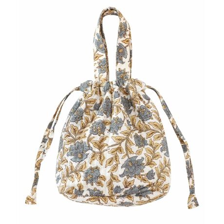 心癒される優しい花柄がフェミニンな印象のブロックプリントの保冷巾着バッグ。