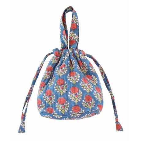 心癒される優しい花柄がフェミニンな印象のブロックプリントの保冷巾着バッグ。