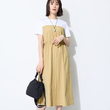 Tシャツとビスチェを重ねたような、一枚でコーディネートが完成するドッキングデザインです。