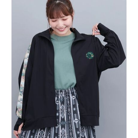 アースカラーで統一されたサボテンの総柄や、袖の配色ラインがアクセントになったトラックジャケット。