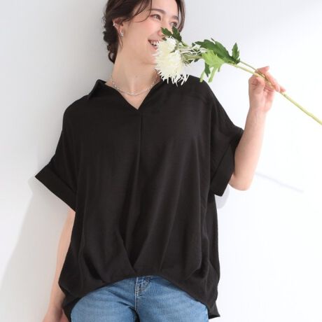 スキッパー衿で顔まわりをすっきり見せつつ、フロントのタックデザインがさりげない立体感をプラス。