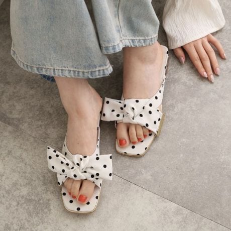 スクエアのクリアヒールが可愛いリボン付きミュールサンダルです。