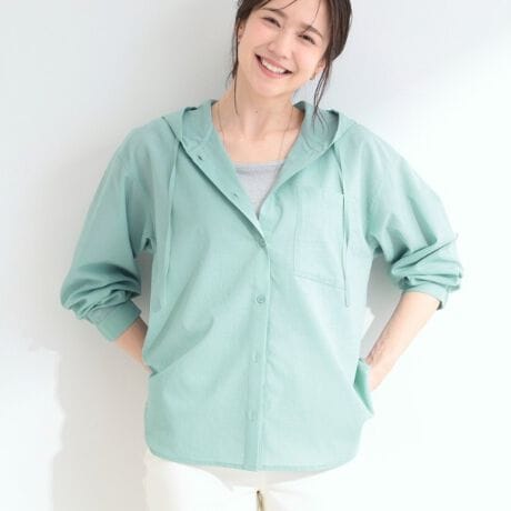 通気性に富んだ素材で、軽やかな印象のフード付きシャツ。