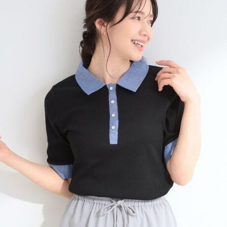 衿と前立ての配色切替で顔まわりが明るく見え、パール調の釦が上品なアクセントになっているポロシャツ風トップスです。