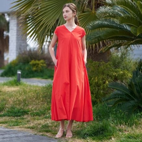 すっきりした肩周りから、なだらかに広がるフレアシルエットが美しく、歩く度に揺れる裾が印象的なワンピース。