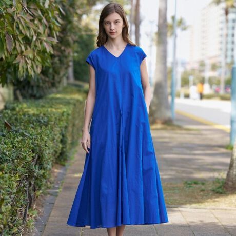 すっきりした肩周りから、なだらかに広がるフレアシルエットが美しく、歩く度に揺れる裾が印象的なワンピース。