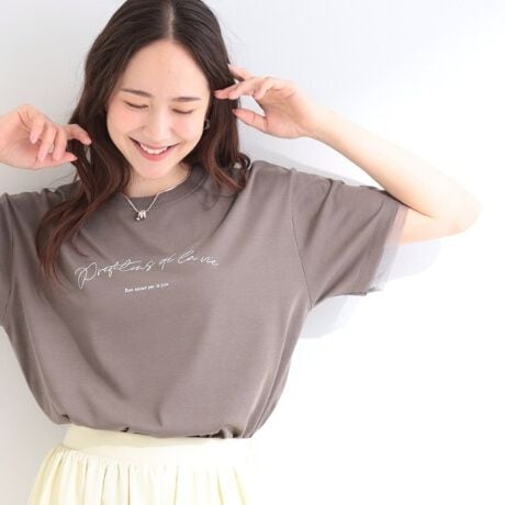 きれいめなプリントデザインが印象的な、上品さと抜け感を兼ね備えた袖チュールレイヤードTシャツ。