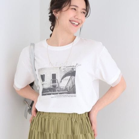 きれいめなプリントデザインが印象的な、上品さと抜け感を兼ね備えた袖チュールレイヤードTシャツ。