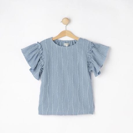 袖がフリルになっており着るだけでおしゃれ見えする1枚です。