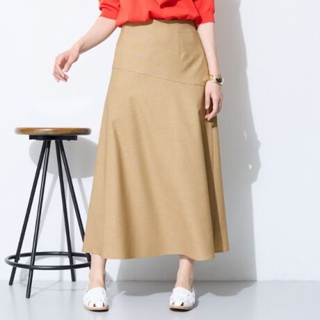腰回りは心地よくフィットし、裾に向かって控えめに広がるナローなフレアラインが立ち姿を美しく見せてくれます。
