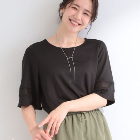 袖のシアー素材の涼し気な切り替えデザインがポイントのトップス。