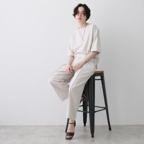 ゆったりとしたトップスとすっきりシルエットのパンツのバランスで、体のラインを拾いにくく自然に体型カバー。