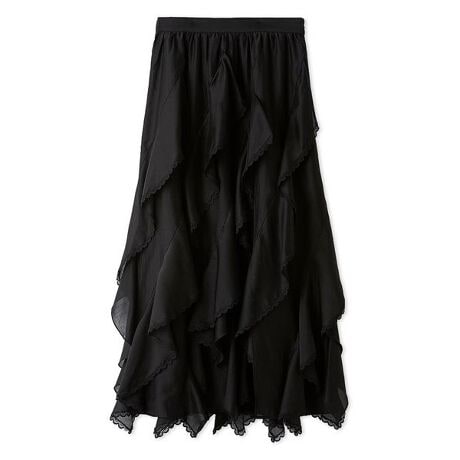 ランダムフリルにレーストリミングを施したロングスカート。