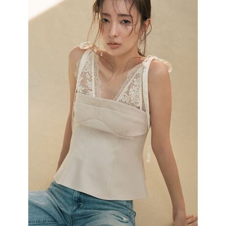 レースのブラトップをレイヤードしているような技ありビスチェトップスがトレンドライク。