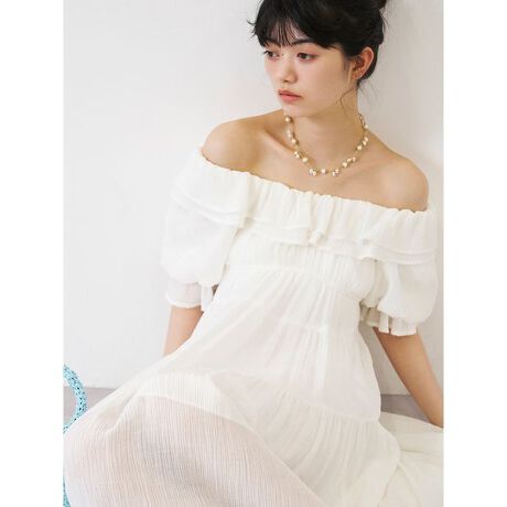 </b>涼しげな楊柳素材を贅沢に使用した、ボリュームたっぷりのロングワンピース。胸元にあしらったスカラップ刺繍のフリルが、顔周りを華やかに演出します。肩に乗せてフェミニンに、オフショルにしてヘルシーにと、気分に合わせて2WAYの着こなしが楽しめる仕様に。高めのウエスト切り替えから広がるギャザーが、さりげなく体型をカバーしつつスタイルアップを叶えます。ウエストと袖口はゴム仕様で、快適な着心地にもこだわりました。<b>