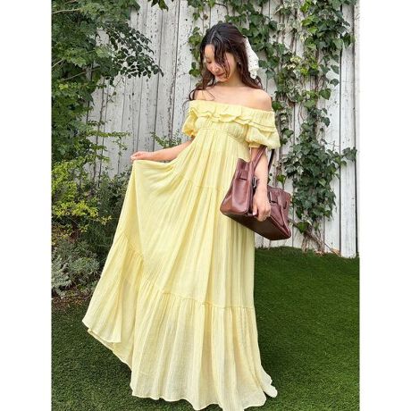 </b>涼しげな楊柳素材を贅沢に使用した、ボリュームたっぷりのロングワンピース。胸元にあしらったスカラップ刺繍のフリルが、顔周りを華やかに演出します。肩に乗せてフェミニンに、オフショルにしてヘルシーにと、気分に合わせて2WAYの着こなしが楽しめる仕様に。高めのウエスト切り替えから広がるギャザーが、さりげなく体型をカバーしつつスタイルアップを叶えます。ウエストと袖口はゴム仕様で、快適な着心地にもこだわりました。<b>