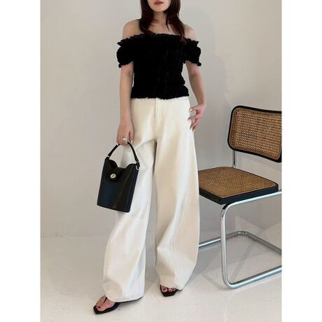 暑い季節でも履きやすい軽めのデニム生地を使用したバレルシルエットのパンツは、今っぽさたっぷり。