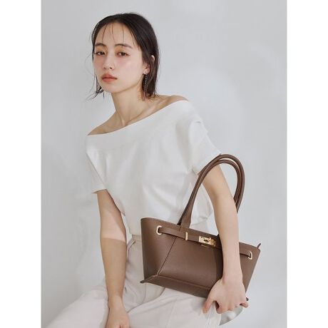 金具付きのベルトデザインでリュクスなアクセントを加えたトートバッグ。