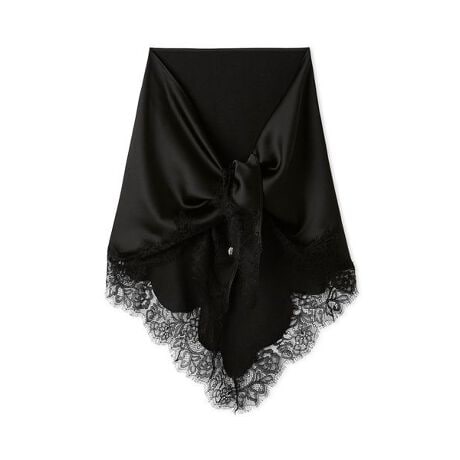 光沢感のあるシルキーなスカーフに繊細なレーストリミングを施したセンシュアルなスカーフ。