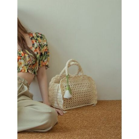 <b>【クロシェ風の編み地とラッフルが愛らしい、フラワーチャーム付きかごバッグ】</b><b>