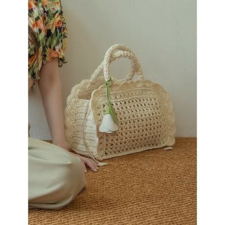 <b>【クロシェ風の編み地とラッフルが愛らしい、フラワーチャーム付きかごバッグ】</b><b>