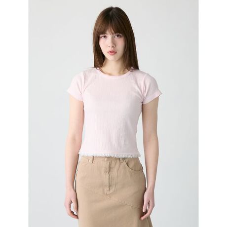 ランダムリブのカットソー生地を使用した、シンプルでコンパクトなTシャツです。短めの丈感に設定し、裾には繊細なレースをあしらうことで、さりげないフェミニンさをプラスしました。裾にはFURFURのロゴ刺繍を施しています。一枚ではもちろん、レイヤードスタイルにも取り入れやすく、デイリーに活躍するアイテムです。