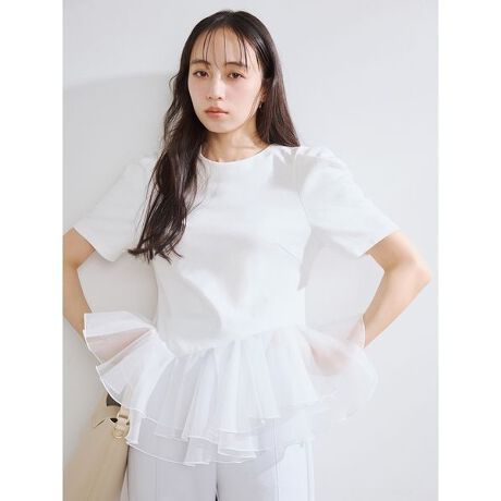 上品な光沢のマットオーガンジーを使用したフリルペプラムをあしらったプルオーバーで華やかに。