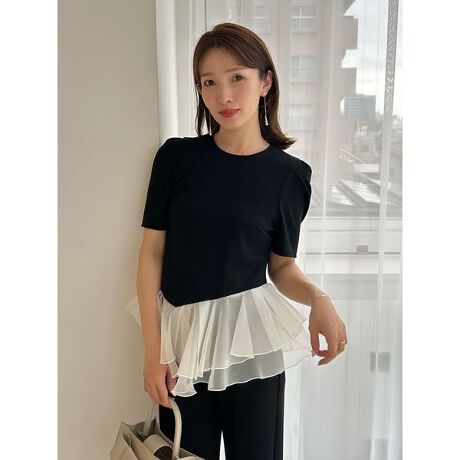 上品な光沢のマットオーガンジーを使用したフリルペプラムをあしらったプルオーバーで華やかに。