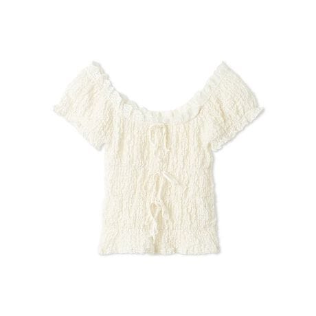大人のガーリー気分に寄り添う、オフショルダーのシャーリングブラウス。