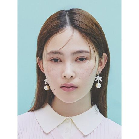 </b>オリジナルのストーンリボンと、存在感のある大きめのパールを組み合わせた目を引くピアス。リボンを直線的なフォルムで表現することで、甘さを抑えたモードなデザインに仕上げました。華やかなドレスアップシーンにはもちろん、デイリースタイルのアクセントとしても重宝する、シーンレスに活躍するアイテムです。
