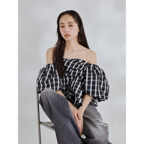 ハリのある素材を贅沢に使用したベアブラウスは、存在感のある構築的なシルエットが特徴。